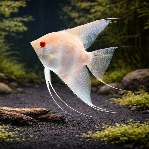Albino Red Cap Angelfish (Pterophyllum scalare) The Albino Red Cap Angelfish is a striking freshwater showpiece, known for its glowing white body a...